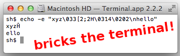 * We earlier wrote that this misbehaving sequence "crashes" the OS X Terminal.app. This was mistaken—instead, Terminal.app interprets the escape sequence as shutting off keyboard input, and because of an unrelated bug in Terminal.app, it is not possible for the user to restore keyboard input by resetting the terminal from the menu.